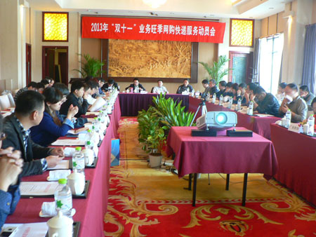 为贯彻落实国家邮政局马军胜局长在部署群众路线教育实践活动下一阶段工作会议上的讲话精神,10月25日,中国快递协会召集快递企业和电商平台,在浙江杭州召开2013年“双11”业务旺季快递服务动员大会,动员部署快递旺季服务保障工作,协调解决快递与电子商务在业务对接方面存在的瓶颈,切实保障“双11”期间快递服务的平稳运行。国家邮政局市场监管司、新闻宣传中心、消费者申诉中心、部分省(区、市)快递行业协会等部门参加了本次会议。