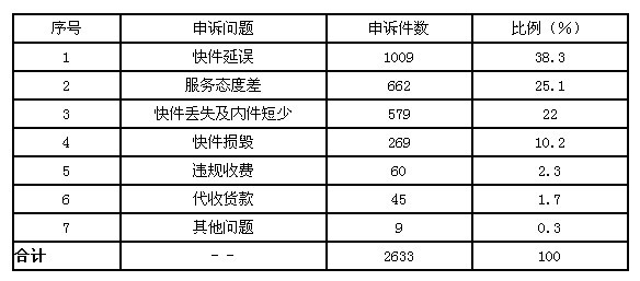 6月,受理消费者关于快递业务的有效申诉2633件。比上月增加136件,增长5.5%。其中,反映快件延误的1009件,占38.3%;反映服务态度差的662件,占25.1%;反映快件丢失及内件短少的579件,占22%;反映快件损毁的269件,占10.2%;反映违规收费的60件,占2.3%;反映代收货款问题的45件,占1.7%;反映其他问题的9件,占0.3 %。