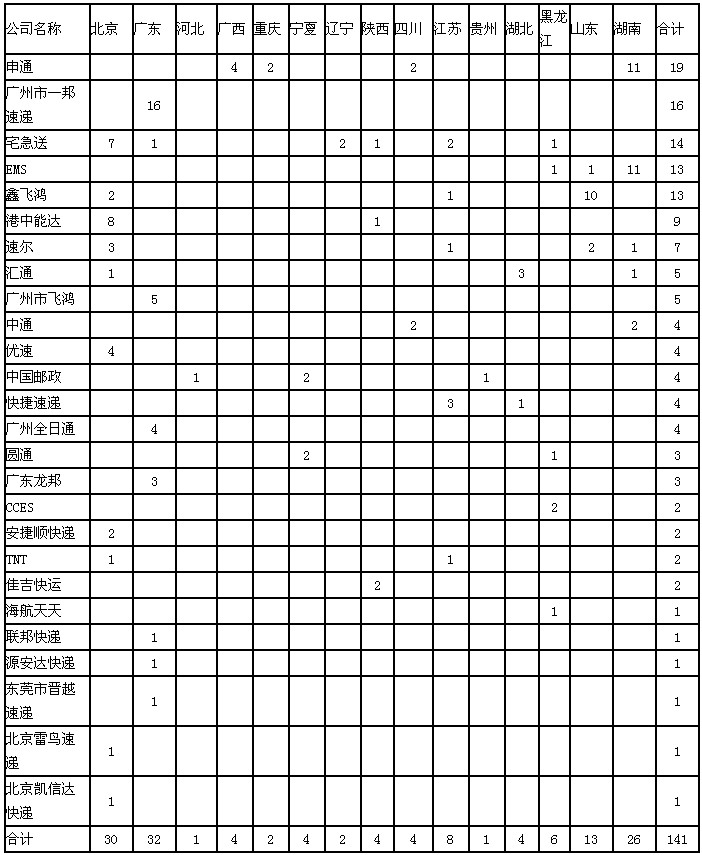 3月,快递企业对省邮政管理局转办的申诉未能按规定时限回复的有141件,其中:申通快递19件、广州市一邦速递16件、北京宅急送快运14件、中国邮政速递物流公司(EMS)13件、鑫飞鸿快递13件。