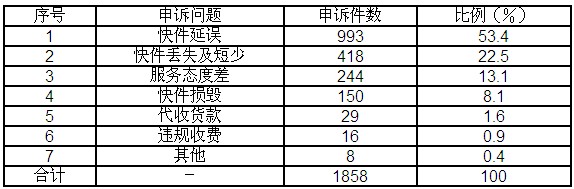 12月,受理消费者关于快递业务的有效申诉1858件,比上月增加514件,增长38.2%。比上年同期增加1081件,增长139.1%。其中,反映快件延误的993件,占53.4%;反映快件丢失及内件短少的418件,占22.5%;反映服务态度差的244件,占13.1%;反映快件损毁的150件,占8.1%;反映代收货款问题的29件,占1.6%;反映违规收费的16件,占0.9%;反映其他问题的8件,占0.4%。